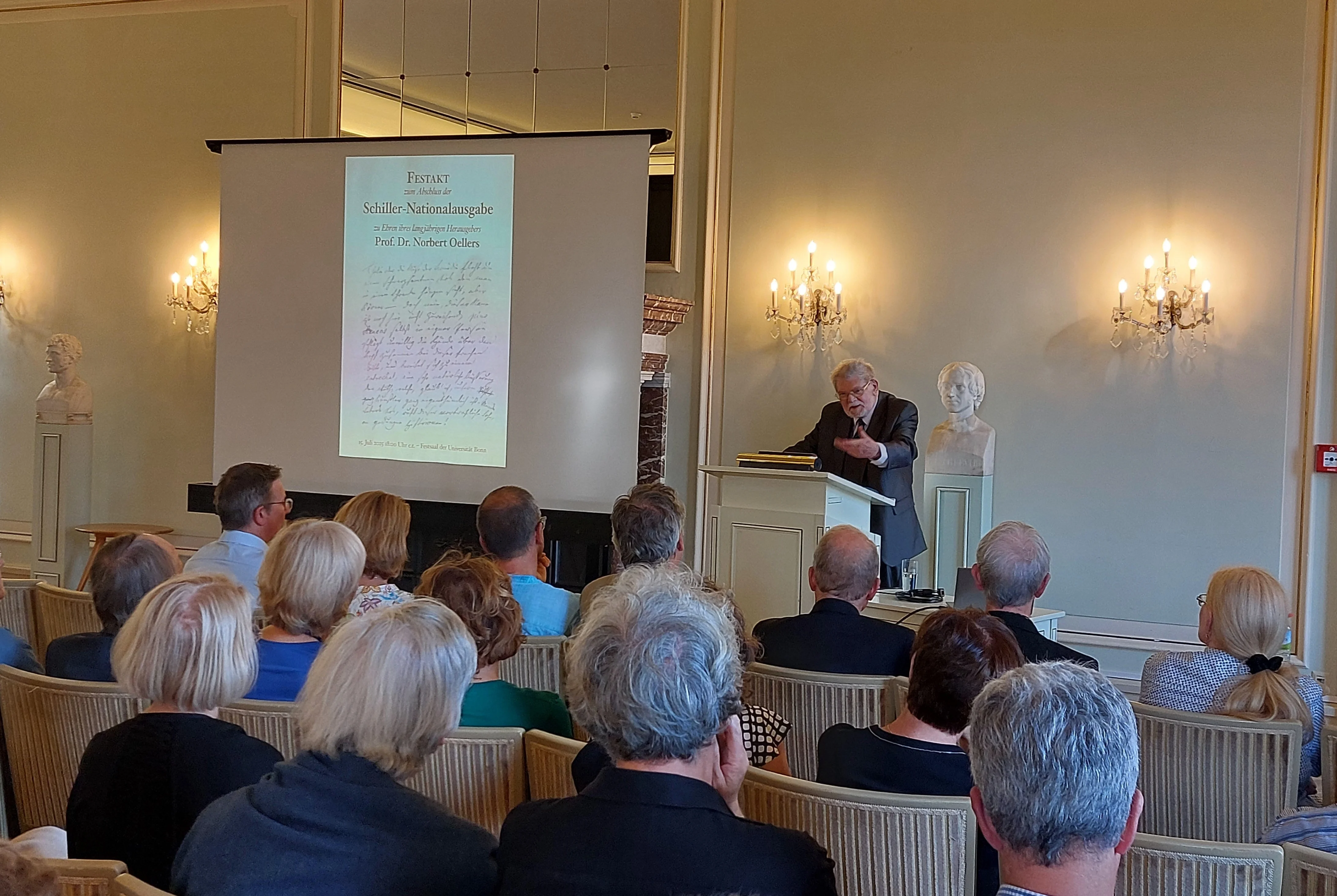 Die Philosophische Fakultät und das Institut für Germanistik, Vergleichende Literatur- und Kulturwissenschaft der Universität Bonn ehrten Prof. Oellers am 15. Juli 2025 mit einem Festakt im Festsaal der Universität.